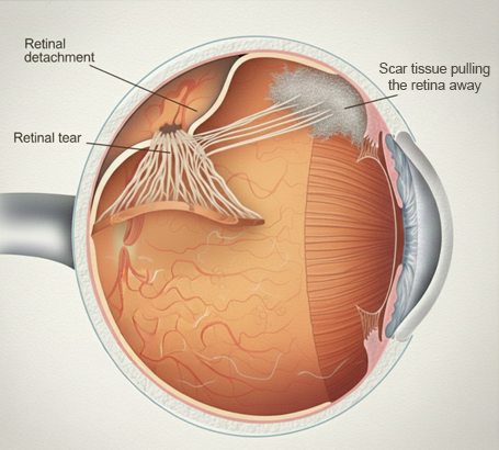 Scar tissue pulls the retina away from its normal position, leading to severe vision impairment.