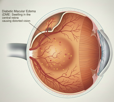 Diabetic Macular Edema (DME) Swelling of the macula (the central part of the retina), leading to blurred or distorted central vision. DME can occur at any stage of diabetic retinopathy.
